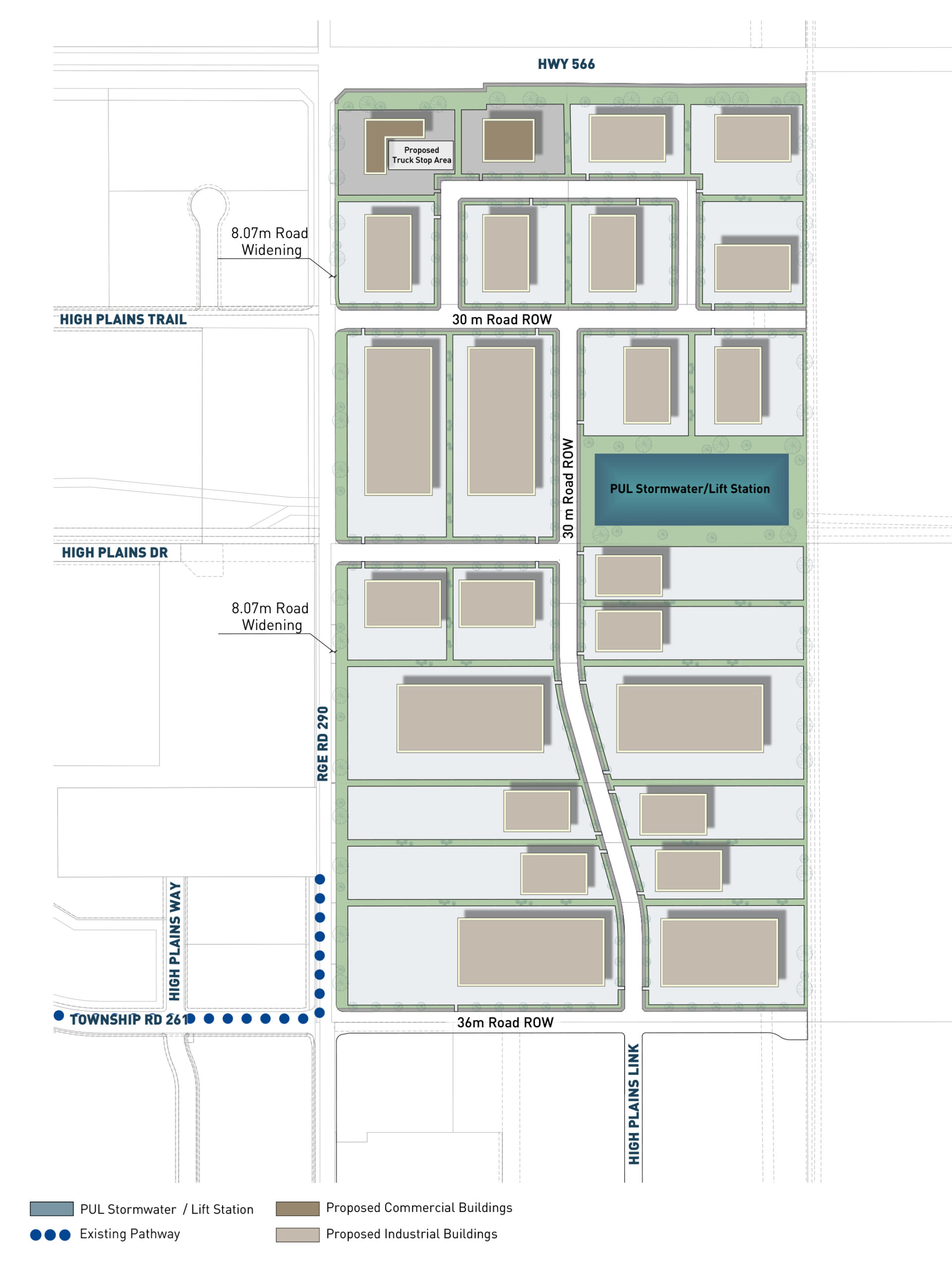 Design guidelines will coordinate building form, landscaping, and signage, with landscaped buffers and treatments along Highway 566 and Range Road 290 to enhance appearance and provide appropriate screening along agricultural interfaces to the east.